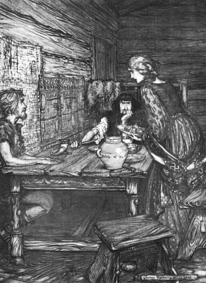 Зигмунд, присев к столу, задумчиво смотрит в пространство. Зиглнида, севшая рядом с Хундингом. против Зигмунда, глядит на последнего с заметным участием и ожиданием.