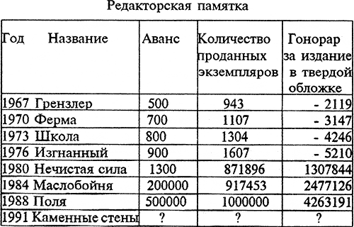 Так как мы были теми самыми персонами, которые отвечали за достижение этих результатов, изучив цифры, я недоверчиво покачал головой. Миссис Мармелл обратила мое внимание на цифры, те, что я не видел, когда был здесь в последний раз, — ткань обивки закрывала три последние строчки. Это были данные о книгах, последовавших за «Нечистой силой».