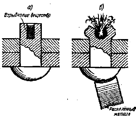 Недавно взрывчатые вещества получили новое применение в промышленности — для клёпки взрывным способом. Особое значение этот способ имеет в авиационной промышленности. При постройке современного тяжёлого бомбардировщика приходится устанавливать около миллиона заклёпок. Легко себе представить, сколько труда затрачивается на это при обычном способе клёпки! При взрывном способе в цилиндрическом конце заклёпки устраивается небольшой канал, в котором помещается маленький заряд специального взрывчатого вещества.