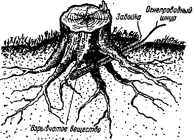 Известно, какую тяжёлую и трудоёмкую работу представляет корчёвка пней, когда она производится вручную. При взрывной корчёвке в почве у пня бурят углубление так, чтобы конец его оказался под пнём (рис. 22). В это углубление вводят заряд взрывчатого вещества и свободную часть углубления плотно засыпают землёй. Взрыв не только вырывает пень из земли, но и в той или иной степени расщепляет его, облегчая последующее использование пня. Корчёвка пней обычно производится не только для расчистки площадей лесосек, но и для использования получаемой древесины как топлива или как сырья для лесохимической промышленности.