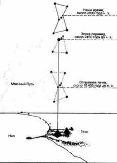 Позже, расположившись на ночевку в пустыне, Бьювэл заметил, что три звезды пояса Ориона расположены столь же асимметрично: третья, самая маленькая звезда выбивается из строя. Бьювэл знал, что древние египтяне считали землю зеркалом неба, и задал себе вопрос: не являются ли пирамиды Гизы отражением пояса Ориона?