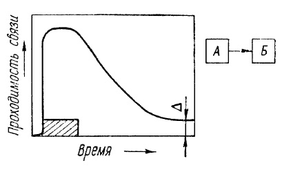 Рис. 18. Типичная динамическая характеристика связи между элементами А и Б. Повышенная проходимость связи остается после прекращения возбуждения элемента А (заштрихованный участок на оси времени). — остаточная проходимость связи, определяющая «вклад» связи в постоянную память.