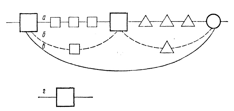 Рис. 19. Схема постепенного забывания и сокращения модели объекта, первоначально состоящей из серии кадров с разной обобщенностью и детальностью,— линия а. Менее значимые и похожие детали заменяются одной — линия б. Потом остаются только две крайние модели (линия в) и, наконец, лишь одна обобщенная модель г.