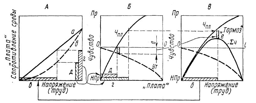 Рис. 23. Формирование оптимального напряжения действия (труда) при взаимодействии системы и среды. А — характеристики среды: а — изменение величины «платы» в ответ на напряжение; б — изменение величины сопротивления среды в ответ на напряжение. В — характеристики рабочего элемента: изменения положительного чувства Чпл в ответ на «плату» и чувства утомления Ут от преодоления сопротивления среды. В — суммарная характеристика: сумма чувств Ч имеет максимум, определяющий интенсивность труда. Уровню напряжения в соответствует «плата» г, сопротивление среды д и «тормоз» деятельности е.