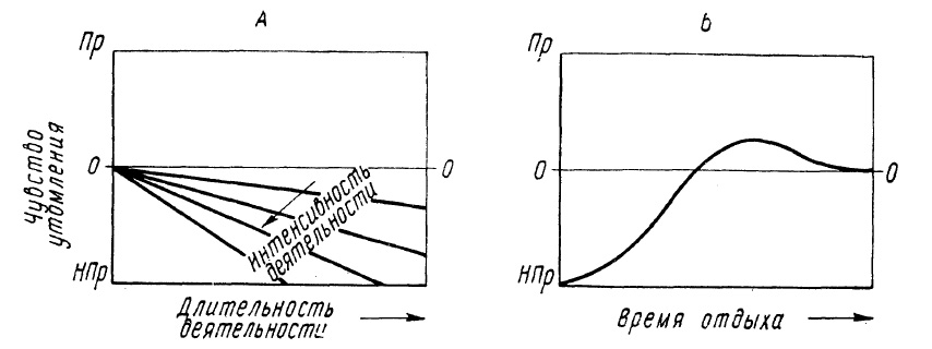 Рис. 25. Характеристика чувства утомления: А — накопление утомления в зависимости от длительности и интенсивности деятельности; Б — динамика чувства во время отдыха.