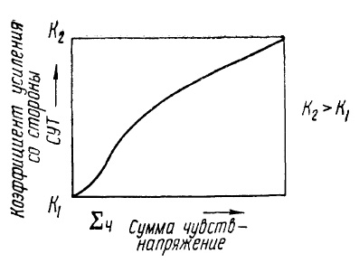Рис. 34. Характеристика СУТ: коэффициент усиления избранной модели со стороны СУТ является функцией «напряжения чувств» (суммы значений чувств .Ч ).