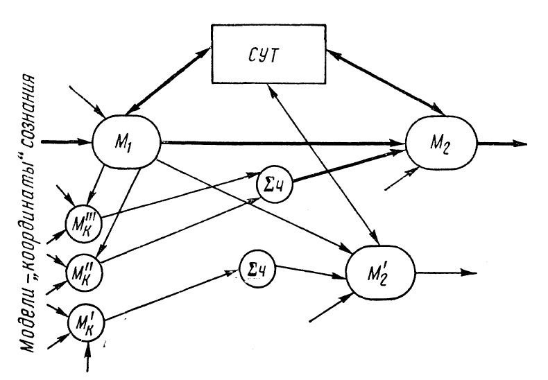 Рис. 35. Схема переключения СУТ (переключения сознания): М1 — последняя модель, находившаяся в сознании; М2 — следующая модель для захвата СУТ — сознания. Ее высокий уровень активности предопределен получением активности от модели М1 и от суммы чувств Ч, которые в 1 свою очередь возбуждены от моделей — «координат» сознания (время, пространство, отношения и пр.) М'К, М''К, М'''К. «Конкурирующая» модель М'2 имеет более низкую активность и остается в подсознании.