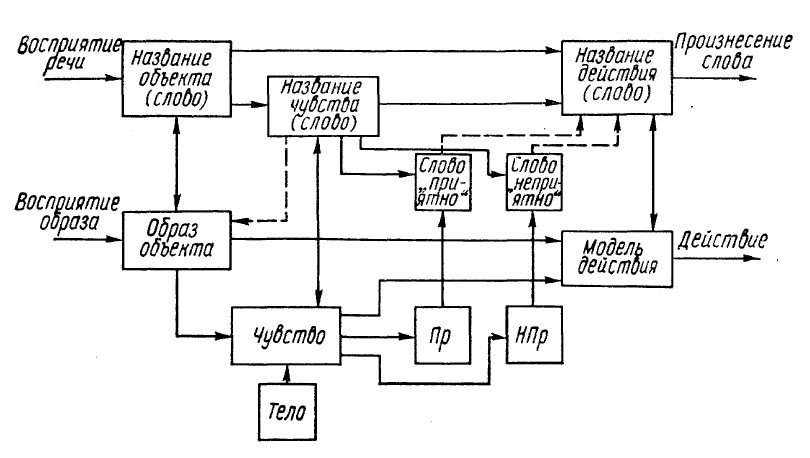 Рис. 36. Взаимоотношение моделей образов и моделей речи. Моделям образов объекта, чувств и действий соответствуют модели словесных эквивалентов. Между ними имеются прямые и обратные связи, так что они могут взаимно активировать друг друга.