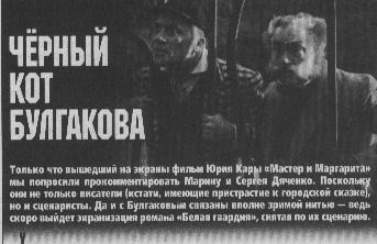 Только что вышедший на экраны фильм Юрия Кары «Мастер и Маргарита» мы попросили прокомментировать Марину и Сергея Дяченко. Поскольку они не только писатели (кстати, имеющие пристрастие к городской сказке), но и сценаристы. Да и с Булгаковым связаны вполне зримой нитью — ведь скоро выйдет экранизация романа «Белая гвардия», снятая по их сценарию.