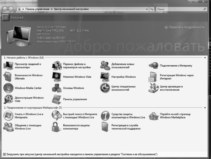 Эта панель – одна из фирменных изюминок Vista: она обязательно выскочит на экран при первой загрузке системы. Хотя функциональность этого «центра» под очень большим вопросом (примерно две трети иконок иначе как рекламным балластом не назовешь), здесь присутствуют несколько действительно важных значков, которые помогут нам произвести самые необходимые операции по настройке. И очень удобно, что не придется обшаривать все закоулки меню Пуск и прочих системных папок для того, чтобы их найти – здесь они собраны в одном месте:
