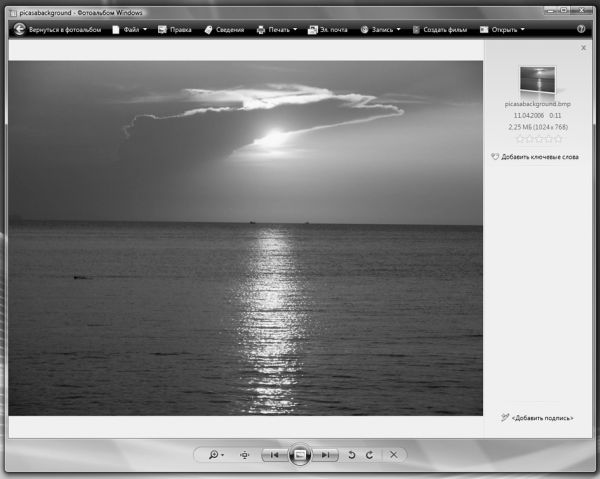 Разработчики Vista добавили в программу еще и функции менеджера фотографий! Собственно в этом режиме Фотоальбом и запускается, если вы вызовите его из меню Все программы: в режиме же просмотра достаточно щелкнуть по ссылке Вернуться в фотоальбом.