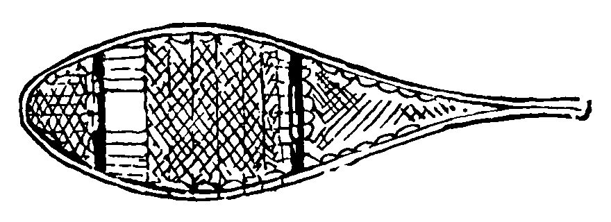 В таком виде рамы оставили для просушки, а индеец тем временем занялся приготовлением ремней. Оленью шкуру он посыпал свежей древесной золой и положил в тину. Спустя неделю он счистил с неё шерсть, удалил висящие кругом обрывки и затем растянул её. Получилась мягкая, гибкая и белая кожа. Куонеб начал резать её с краёв спиралью, сделав таким образом длинный ремень в четыре дюйма ширины. Так продолжал он, пока не изрезал всей шкуры и не получил цельного ремня в несколько метров длины. Вторая оленья шкура была гораздо меньше и тоньше. Он наточил поострее нож и вырезал из неё ремень наполовину уже первого. Всё было готово и оставалось только сплести подошву; более тонкий ремень предназначался для передней и задней части лыж, более толстый — для середины, где ставится нога. Настоящий мастер, пожалуй, посмеялся бы над такими лыжами, но тем не менее они были прочны и удобны.