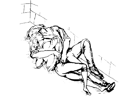Утром Артур открыл глаза и ужаснулся — Ксав и Нэд мирно дрыхли в обнимку. Суорд быстро глянул на Блада. Тот еще спал. Артур тихо подкрался к влюбленной парочке и от всего сердца примочил Куто пониже спины. Ксав зашевелился, голова его скатилась с могучей груди Волверстона и больно стукнулась о каменный пол.