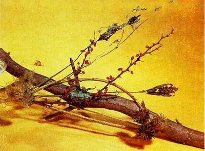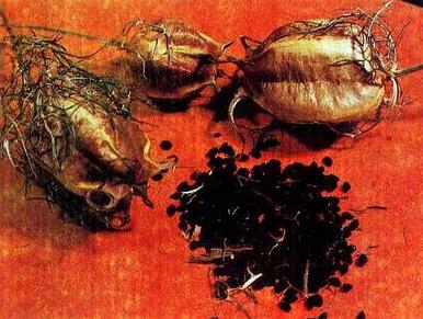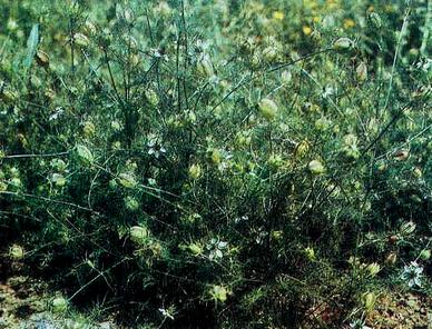 Чернушка посевная: вверху — общий вид растения; внизу — цветоносы и семена.