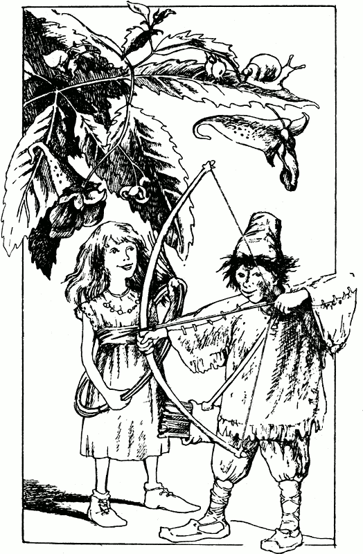 Спиллер передал ей колчан. Он был сделан из пальца от перчатки, крепкой перчатки из толстой кожи; стрелы — из сухих сосновых игл с грузилом на одном конце и шипом от терновника на другом.