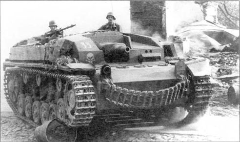 StuG III из состава 192-го дивизиона штурмовых орудий вермахта. Цвет «черепа» на символике — желтый, тактический номер на САУ — «33». Группа армий «Центр», район Брест-Литовска, июль 1941 года (РГАКФД)