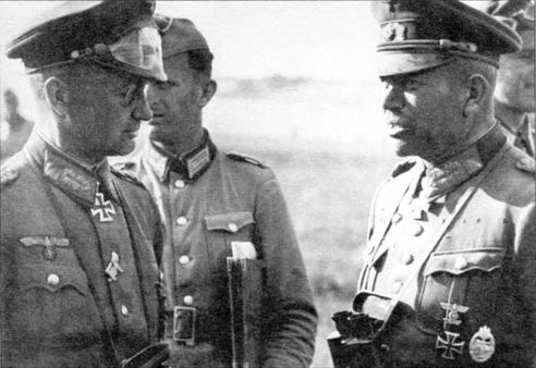 Командующий 2-й танковой группой генерал-полковник Гейнц Гудериан обсуждает с командиром танкового корпуса генерал-лейтенантом Вальтером Моделем (слева) детали предстоящего наступления. Группа армий «Центр», июнь 1941 года (РГАКФД)