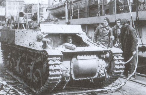 Погрузка техники экспедиционных сил на транспортные корабли в порту Бреста. На фотографии гусеничный французский транспортер «Лоррейн» (регистрационный номер «60166»). Франция, середина апреля 1940 года (АВЛ)