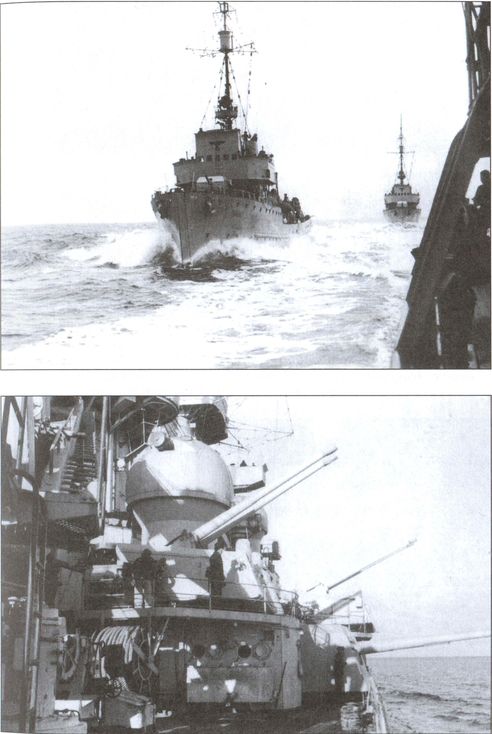 Операция началась! Немецкие корабли класса M-Boote вышли в море. Рядом 105-мм (сдвоенные) и 150-мм орудия линейного корабля «Шарнхорст» в готовности открыть огонь по норвежским береговым укреплениям. Апрель 1940 года (АВЛ)