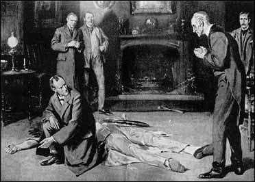 — Верно. Взята была новая свеча, и она успела сгореть не больше чем на полдюйма. Он поставил ее на стол, прежде чем произошло нападение, иначе она должна была бы упасть вместе с ним. Это доказывает, что на него напали не сразу после того, как он вошел в комнату. Когда явился мистер Бэркер, свет был зажжен, а свеча потушена. Из этих предположений я постараюсь воспроизвести сцену убийства. Мистер Дуглас входит в комнату, ставит свечу. Показывается человек из-за гардины. Он вооружен ружьем. Требует обручальное кольцо — Бог знает, зачем, но это, наверное, было так. Мистер Дуглас отдает его. Тогда — или хладнокровно, или борясь — Дуглас хватает молоток, найденный на ковре. Человек стреляет в него, потом бросает ружье, а также и эту странную карточку «Д. В. 341» и убегает через окно, спускается в ров как раз в тот момент, когда Бэркер обнаружил преступление. Как вы считаете, мистер Холмс?