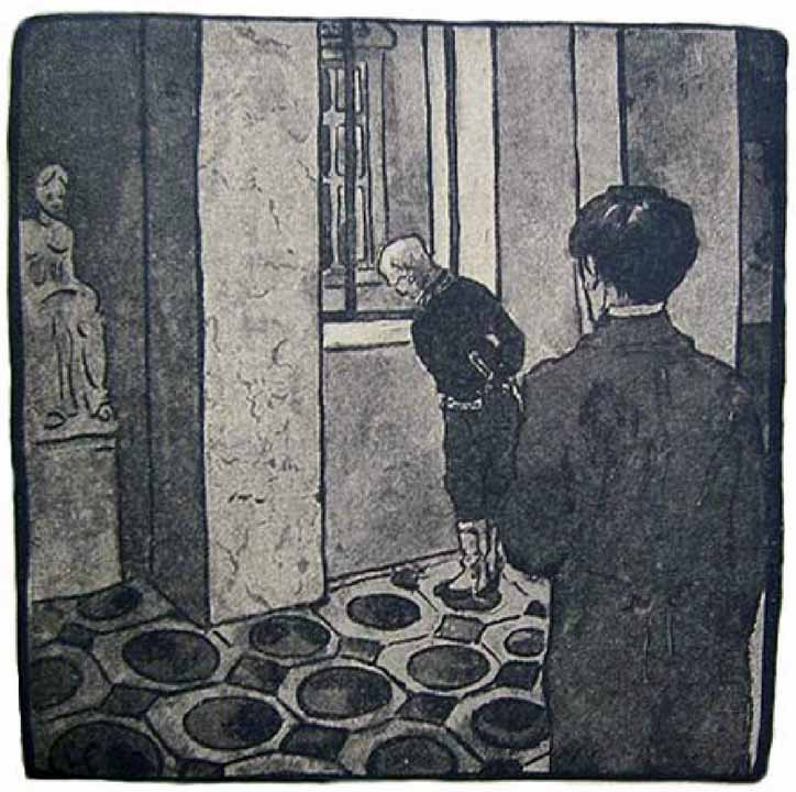 Мне хотелось прикоснуться к этой тихой фигуре, но почему-то я не решился. Я обошел ее и направился в смежную комнату. Там был почти сумрак; смутно различил я и опознал знакомые статуи, сидящие здесь. Большое окно в глубине бедно пропускало свет буроватого оттенка, и чрез него, как сновидение, глядела стена Зимнего Дворца. Новая человеческая фигура неясно рисовалась у окна; проходя, мельком видел я, что это был двойник капельдинера, стоявший неподвижно, повернувшись спиной ко мне. Мутный свет из окна странно отражался на ее лысой голове.