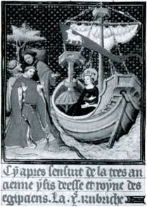 7. Надпись на гравюре XV века гласит: «Древняя богиня и царица египтян». Обратите внимание на форму ладьи и на изображение собаки на штандарте, символизирующее «Песью звезду», или Сириус.