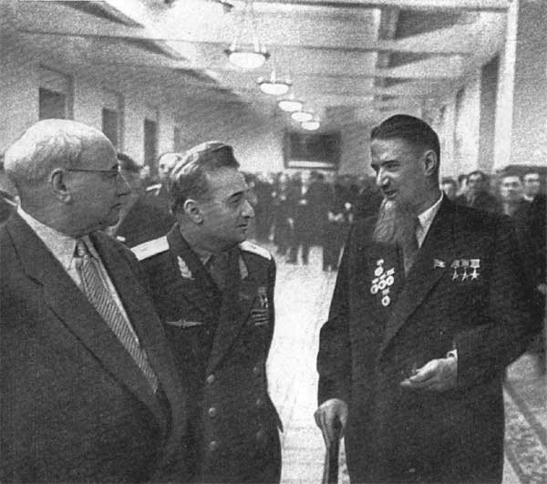 А. Н. Туполев, Ар. И. Микоян, И. В. Курчатов (слева направо) на сессии Верховного Совета СССР.