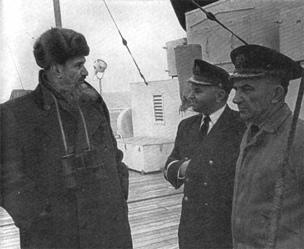 И. В. Курчатов на теплоходе «Адмирал Нахимов» беседует с моряками.