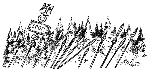 Не прошло и десяти дней, как легион начал нагружать повозки тяжелыми щитами и доспехами. Изогнутые войсковые трубы дали сигнал сбора. Шесть тысяч пар грубых сандалий зашагали по дороге к мосту под звяканье медалей на груди ветеранов, постукивание мечей на правом боку, ритмичные движения копий над головами. Тяжелые мешки с запасной обувью, шанцевыми инструментами и трехдневными пайками висели на палках за плечами солдат. Впереди вышагивал знаменосец, высоко держа сверкающего римского орла, в шлеме, поверх которого была надета голова волка с оскаленными зубами. Позади несли маленькие знамена. Длинные трубы и горны качались на плечах легионеров, двигающихся к мосту. Бравые военачальники ехали рядом, белые плащи развевались на ветру. Мужественные загорелые лица были с надеждой повернуты к серой реке, мосту, непроходимой чаще. Никто не оборачивался. Топот кавалерии, скрип колес, крики погонщиков, дикие песни наемников смешивались в рев, который постепенно превращался в слабое бормотание и таял вдали. К полудню легион уже переправился на далекий берег, и теперь его можно было разглядеть только по солнечным бликам на железных щитах. Позади быстрый Рейн качал мост, а земляные форты по обеим берегам выглядели совсем покинутыми.