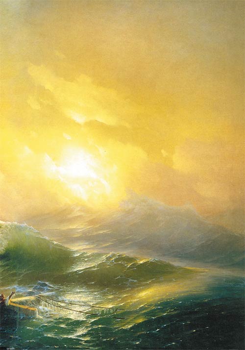 Назвав картину “Девятый вал”, Айвазовский вступил в диалог с морем. Греки считали губительной третью волну, римляне – десятую, моряки – девятую. Не важно, кто прав, важно, что считают, причем то, что, как песок и снежинки, не поддается учету. Внести цифру в обиход натуры – значит подчинить ее разуму и уподобить себе. Но море не говорит по-нашему. Не нуждаясь в языке, оно, как Солярис, творит без посредства символов – себя из себя, волну за волной. Выделив одну из них, художник придал волне индивидуальность, лишенную, однако, человеческих или даже животных, как у Хокусая, черт. Тем не менее вал Айвазовского узнаваем и в три четверти и в профиль. Сила этой волны не в высоте, а в глубине – в энергии, берущей начало в уходящем будто ко дну основании. Неторопливая, как танк над окопом, она полна той уверенности в себе, что не предусматривает переговоров. О людях этого не скажешь. Подняв красный (вместо более уместного тут белого) флаг, они ждут от волны ответа, словно не догадываясь, каким он будет. Уцелевшие встречают беду сплоченной группой – как кулак с разжатым пальцем: четверо прижались друг к другу, один уже в воде. Их общая надежда – оставшаяся от корабля мачта. Утратив хитроумный такелажный убор, она стала примитивным бревном, подозрительно напоминающим лежащий крест, который вот-вот поднимут.