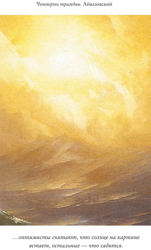 Затормозив, как Хичкок, у развязки, Айвазовский обещает каждому по его вере: оптимисты считают, что солнце на картине встает, остальные – что садится. Художник твердо объявил, что девятый вал будет решающим – последним. Но мы не знаем, переживут ли его герои картины. Возможно, потому что они – не ее герои. Сюжет и фокус “Девятого вала” в композиции. Спрятанный прямо на глазах зрителей умысел автора откроется нам, если мы разрежем его картину (но лучше – репродукцию) на четыре части. Нам только кажется, что в центре полотна – люди. На самом деле они смещены в левую четверть холста. Если бы картина исчерпывалась этим – нижним – квадратом, “Девятый вал” стал бы героической схваткой равных. Но если смотреть на всю левую половину, то выйдет не дуэль, а бойня. Зато вторая часть холста принадлежит другому жанру. Оставив трагедию слева, правая половина картины впадает в идиллию. Плохая погода? Смотря для кого – морю в самый раз. Низкие облака счастливо сливаются с водой, празднуя брак двух стихий, которые разлучает штиль и объединяет буря. Болея за своих, мы не замечаем чужого праздника, но это не мешает его пиротехнике, которой отведена большая и лучшая часть полотна. В сущности, это – любующийся собой пейзаж, куда людей ввели для сравнения. Здесь, в пейзаже, и следует искать драму – драму масштаба, расставляющего все, включая нас, на свои места. “Море, – как писал по другому поводу Горький, – смеялось”. Тем, добавлю, гомерическим смехом, которым разражаются олимпийцы, сравнивая нашу бренную жизнь с собственным бессмертием. Другое дело, что война, как это с ней всегда и бывает, выявляет у соперников много общего. Судьба тонущих людей – точно такая же, что и у девятого вала: откуда пришел, туда и вернется. Плоть от плоти своего мира, он ничем не отличается от нее. Кроме, разумеется, славы.