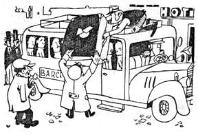 Обычно ребята ездили на стадион без багажа, но на этот раз Клапзуб стащил вниз по лестнице огромный чемодан, недавно купленный в Берлине; ребята даже не знали, что, собственно, в нем лежит. Слуга со швейцаром водрузили чемодан на крышу автобуса, ребята уселись, а старик, как обычно, устроился около шофера. Автобус зафырчал и покатил к стадиону. Старый Клапзуб повеселел было, но, как только по дороге увидел людей, которые, направляясь на матч, враждебно смотрели на его сыновей, не мог удержаться от проклятий и всю дорогу ругался.