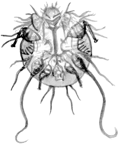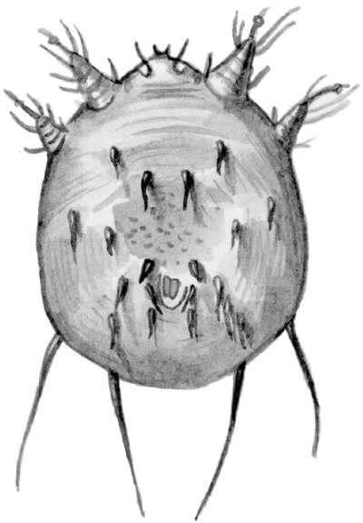 Зудневые клещи: 1 – род Sarcoptes; 2 – род Notoedres; а – самец, брюшная поверхность; б – самка, спинная поверхность