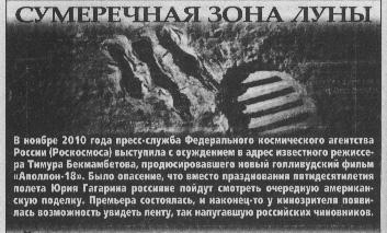 В ноябре 2010 года пресс-служба Федерального космического агентства России (Роскосмоса) выступила с осуждением в адрес известного режиссера Тимура Бекмамбетова, продюсировавшего новый голливудский фильм «Аполлон-18». Было опасение, что вместо празднования пятидесятилетия полета Юрия Гагарина россияне пойдут смотреть очередную американскую поделку. Премьера состоялась, и наконец-то у кинозрителя появилась возможность увидеть ленту, так напугавшую российских чиновников.