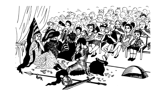 Добравшись наконец до зрительного зала, маленькие ценители искусства начинают поиск своих мест. Происходит это под шум и гам, ими же производимый. Билетеры в шоке, учительница в полуобморочном состоянии.
