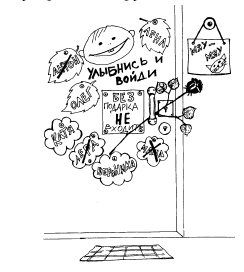 Можно сделать и такое: если у тебя дома найдется специальная смывающаяся краска одного или разных цветов, то нарисуй на двери улыбающуюся рожицу, а под ней напиши: "Праздник именно здесь, ты не ошибся" или "Улыбнись еще шире и войди". Это в том случае, если ты не очень хорошо умеешь рисовать.
