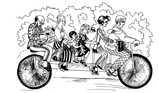 Трехколесный велосипед тебя наверняка уже не радует, да? Остается четырехколесный. Не нравится? Нам тоже не очень, ты уже слишком взрослая для него. А хочешь покататься на тандеме? Это велосипед с сиденьями для двух человек. Существуют велосипеды и для четырех пассажиров.