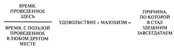 Почему-то для того, чтобы проанализировать и объяснить что-то, человеку приходится снова и снова проходить один и тот же жалкий сценарий — как внуку Фрейда, играющему в fort-da. [71] Но так или иначе все сводится к вопросу времени. Когда вы инвестировали столько часов в какое-нибудь заведение, ваша кредитоспособность растет как на дрожжах и вам хочется ограбить хронологический банк. Вам хочется ходить в это заведение до тех пор, пока вам не вернут потраченное время, даже если этого никогда не случится.