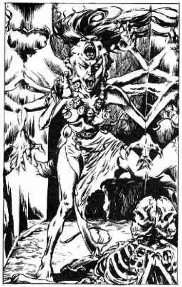 Туннель резко поворачивает направо, и ты оказываешься в некотором подобии выложенной зеркалами галереи. То тут, то там из стен выступают части замурованных скелетов. Неожиданно прямо из зеркала, преграждая тебе путь, появляется чудовищное человекообразное создание с четырьмя руками и четырьмя оскаленными мордами. Вытянув руки, оно медленно направляется к тебе. Это Зеркальный Демон из параллельного измерения пришел за твоей душой. Что ты предпримешь?