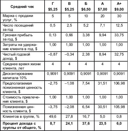 Затраты на привлечение и удержание клиентов были размазаны по всем группам, поскольку реклама была направлена на всех клиентов без разбора. Информация о клиентах, включая затраты на их привлечение и удержание, дала владельцам возможность составить итоговый обзор всей базы клиентов (табл. 3).