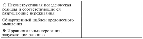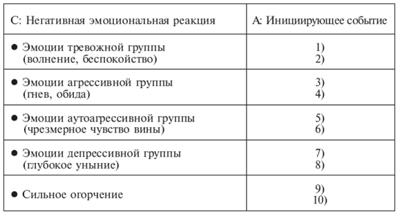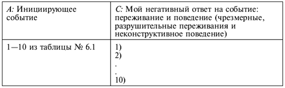 • сильное огорчение, отчаяние.2. Составьте таблицу, где напротив каждой группы переживаний (С) опишите ряд ситуаций (А), в ответ на которые у вас возникли эти эмоции. Постарайтесь вспомнить по несколько ситуаций для каждой группы эмоций. Возможно, некоторые из переживаний вам не свойственны, вы их никогда не испытываете. В таком случае пропустите соответствующую рубрику. Перечень инициирующих событий Таблица 6.1