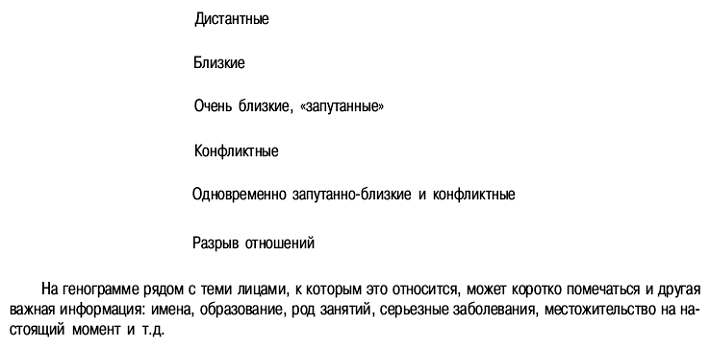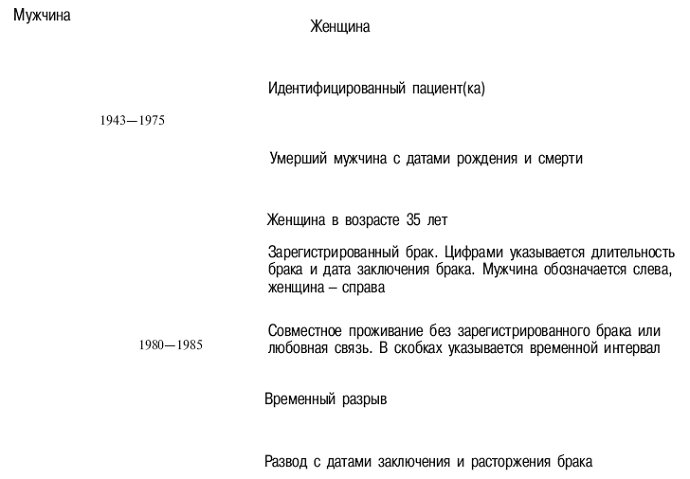 Семейную историю удобно исследовать с помощью техники генограммы (McGoldrick, Gerson, 1985). Генограмма представляет собой форму семейной родословной, на которой записывается информация о членах семьи, по крайней мере в трех поколениях (Bowen, 1978; Carter et al., 1977; Guerin, Pendagast, 1976; McGoldrik, 1977; Pendagast, Sherman, 1977; Brandt, 1980). Генограммы показывают семейную информацию графически, что позволяет быстро увидеть сложные семейные паттерны, и являются богатым источником гипотез о том, как клинические проблемы могут быть связаны с семейным контекстом и развитием. Кроме того, генограмма является кратким резюме и позволяет терапевту, незнакомому со случаем, быстро воспринять большое количество информации о семье и получить представление о ее потенциальных проблемах.