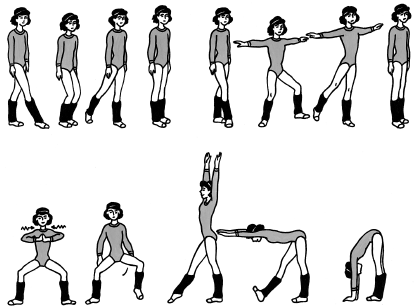 22. И. п. – о. с. 1 – шаг правой вперед; 2 – приставить левую к правой на полупальцы; 3 – шаг левой назад; 4 – приставить правую к левой на полупальцы; 5 – шаг правой в сторону; 6 – приставить левую к правой на полупальцы; 7 – шаг левой влево; 8 – приставить правую к левой на полупальцы. То же с другой ноги. По 8 раз.