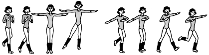 14. И. п. – о. с. 1 – слегка сгибая-разгибая правую, мах вперед; и – правую назад на полупальцы, левую слегка согнуть – положение глубокого выпада; 2 – переступить на левой ноге – слегка приподнять над полом и вновь поставить на всю стопу; 3–6 – повторить 1–2; 7 – приставить правую ногу к левой; 8 – с поворотом кругом левую назад на полупальцы. То же с левой ноги. По 2 раза.