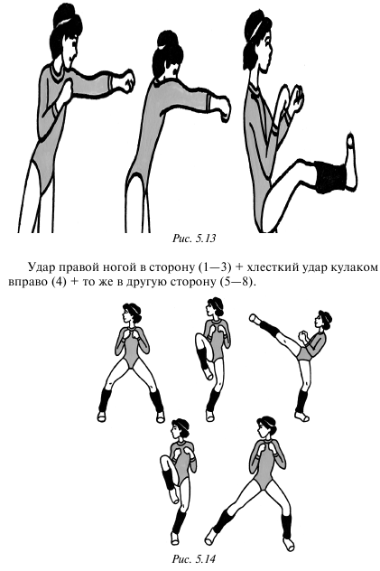 Уклон влево (1) + удар снизу (апперкот) левой рукой (2) + то же справа (3–4).В левой диагональной стойке прямой удар левой рукой (1) + прямой удар правой рукой (2) + прямой удар правой ногой (3) + смена стойки на правую диагональную (4).