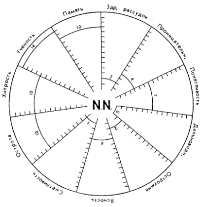 Итак, взглянув на фигуру эту, можете вы вдруг обозреть, из чего составляется ум N. N. Вы видите, что он человек чрезвычайно ученый и что первенствующий в нем род ума есть память, за которою следуют острота, хитрость и так далее. Приведите все роды в порядок по числу градусов, и выйдет следующее заключение: N. N. с чрезвычайною ученостию соединяет необыкновенную память, имеет весьма много остроты и хитрости и довольно понятливости; нет у него также недостатка в некотором количестве проницательности и ясности; но зато остроумия и здравого рассудка очень мало, сметливости и того меньше, дальновидности совсем нет, а глубокомыслия и не ищите.