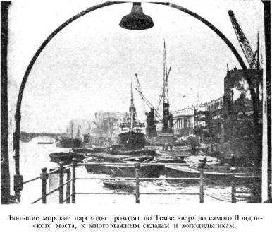 Мимо подъемных шлагбаумов Башенного моста большие морские пароходы проходят по Темзе вверх до самого Лондонского моста, к многоэтажным складам и холодильникам. Если смотреть на Лондонский мост с высоты аэропланного полета, он представляется узким асфальтовым потоком, перекинутым через широкий водный поток реки. По асфальтовому фарватеру утлыми лодками плывут автомобили и бесконечными вереницами тянутся красные баржи автобусов. В речном фарватере суда не столь красочны, менее быстры и менее проворны. Оба потока глубоко залегают среди живописнейших искусственных каменных скал — громадных деловых домов, элеваторов, складов, церквей, монументов и всякого рода хитроумнейших транспортных сооружений.
