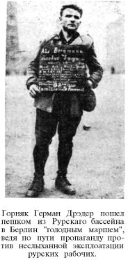 Развлечения в Берлине, культурные и некультурные, заведены на все вкусы и на всякого потребителя. Есть "Спортпалас", вмещающий шесть тысяч зрителей. Тут и борются и состязаются, и 28 представителей различных европейских и американских наций взялись шесть дней под ряд ездить по треку на велосипедах. Действия на длительность очень модны в спортивной Европе. Какой-то чудак в Париже решил не есть 40 дней и 40 ночей. Лег в стеклянный гроб, приставили к нему сторожа, и начал он не есть. Десять дней он выдержал. На одиннадцатый разбил свой гроб и, загнавши сторожа в угол, побежал стремглав в соседний ресторанчик. Немцы показали более высокую марку по части воздержания от пищи. Ихнему "мастеру голодания" — Иолли — удалось проголодать 45 дней. Все это время он пролежал в стеклянной будке в ресторане "Крокодил", худел, обростал волосами и тихо ворочал головой из стороны в сторону. Кругом за стенами будки проходила, шаркая толпа любопытных. Интересовались, нет ли жульничества и действительно ли Иолли ничего не ест? Профессионалы и спортсмены-любители не щадя побивают друг друга в суровом искусстве голодовки на потеху праздным обывателям, развращенным буржуазией. Промышленные кризисы, все более и более глубокие и сильные, беспрерывно потрясающие капиталистические страны, создают миллионные армии безработных, голодающих не ради спорта и забавы, а для того, чтобы обеспечить владельцам фабрик и заводов возможно большую прибыль. Есть и у безработной армии пролетариата свои герои голода. Горняк Герман Дрэдер отправился пешком из Рурского бассейна в Берлин "голодным маршем", ведя по пути пропаганду против неслыханной эксплоатации рурских горняков. Он нес на груди доску, на которой был исчислен весь его нищенский бюджет.