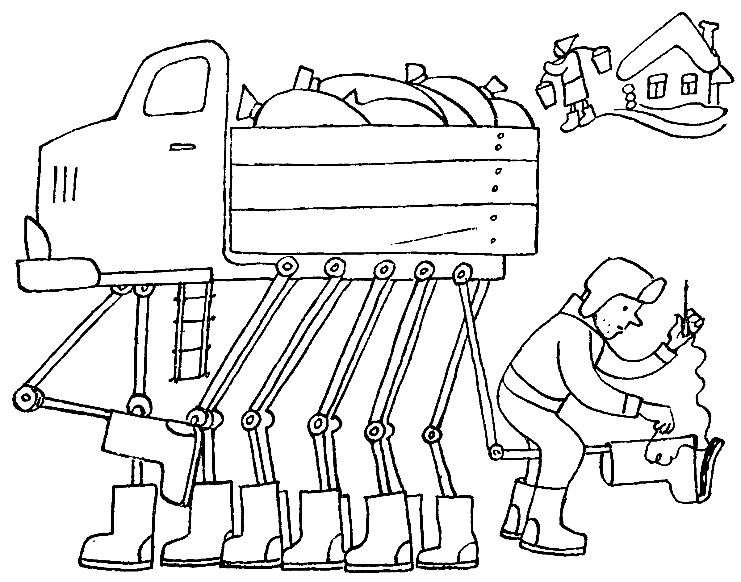 Только вместо двух механических рук ему приходится управлять четырьмя механическими ногами, но зато каждая из ног движется проще в плоскости. Каждая из рук обычного копирующего манипулятора обладает шестью степенями свободы (исключая движение захвата), значит, управляя двумя руками манипулятора, оператору приходится иметь дело с 12 степенями свободы. В шагающем грузовике каждая из ног обладает тремя степенями свободы, для четырех ног получаются те же 12 степеней свободы.
