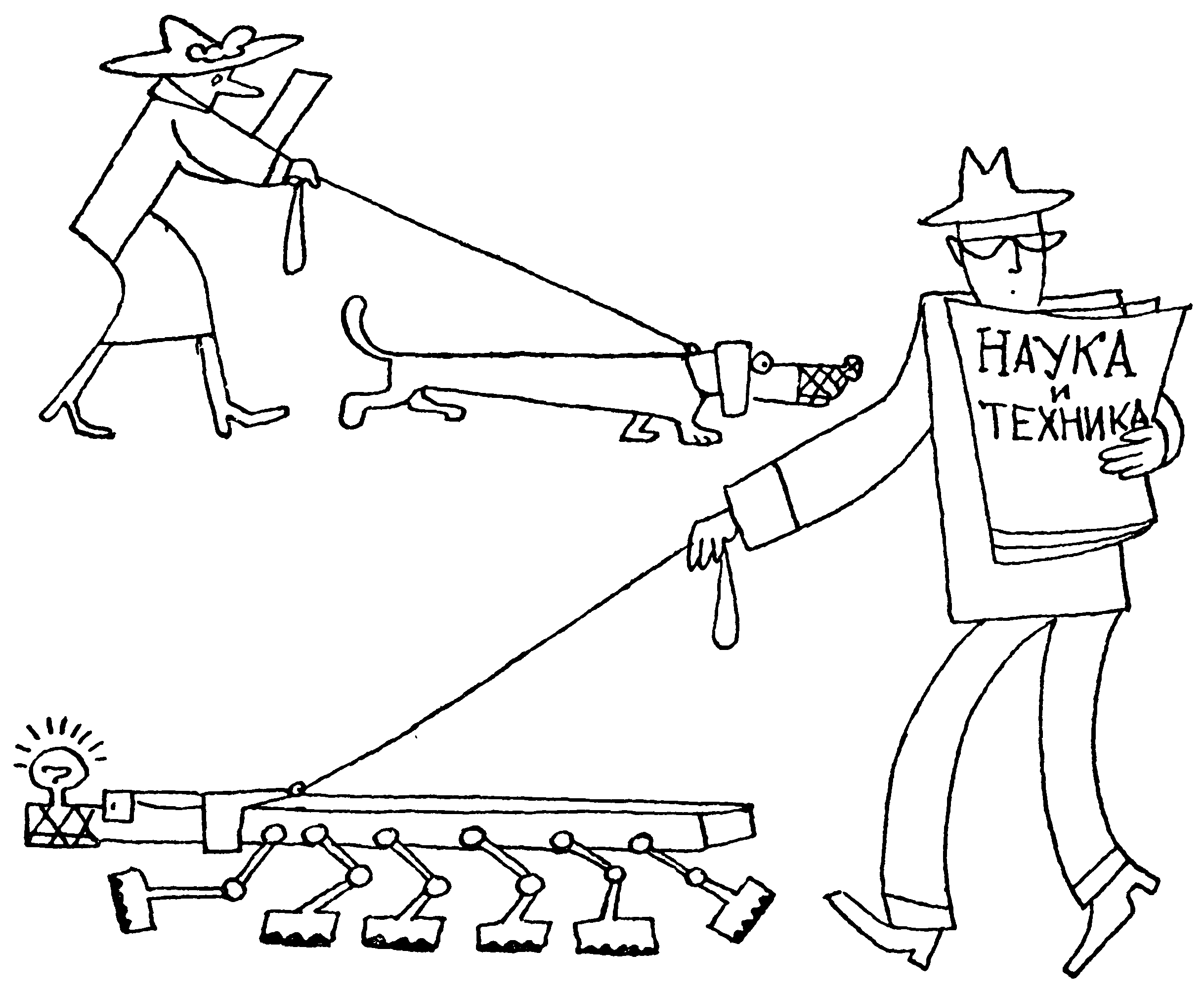 Это означает, что она шагает не только тогда, когда работает приводной механизм, но и в том случае, когда ее толкают или тянут, как, скажем, паровоз тянет вагоны. Значит, можно себе представить две или несколько таких машин, тянущих одна другую. Проект такого поезда, состоящего из пяти "пешеходов", и был разработан.